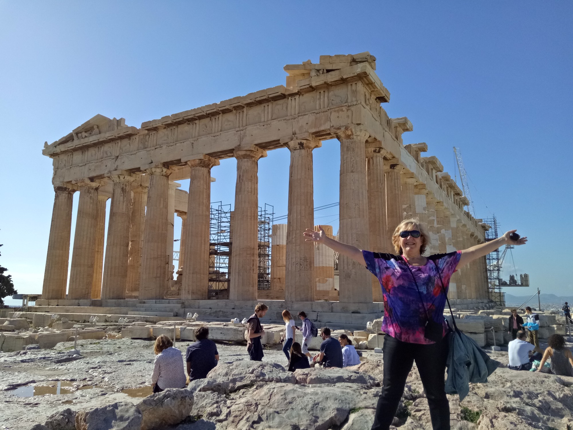 But the Parthenon is calling. I tear myself away and follow the signs up and up, through an enormous carved stone gate, my excitement pushing me faster, until I am on level ground and there it is in front of me. I am here, on top of the world. WOW!